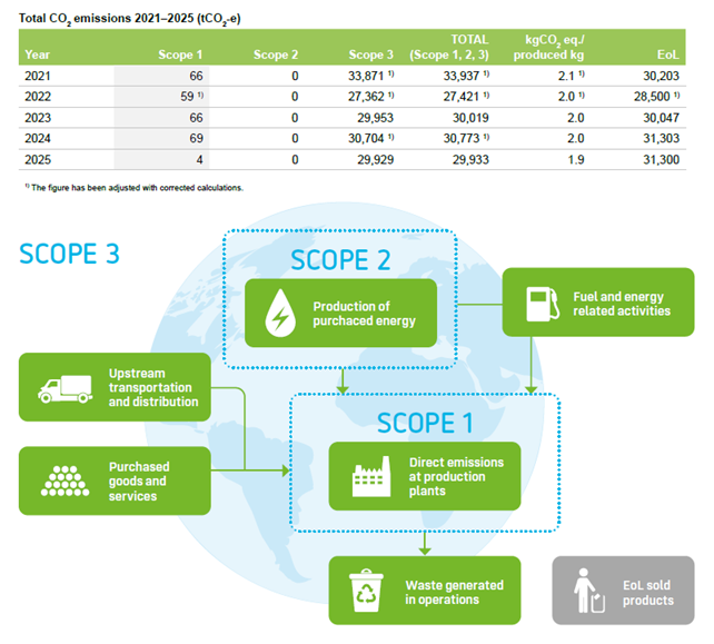 Wir haben den CO2-Fußabdruck unseres Betriebs und unserer Wertschöpfungskette seit 2020 berechnet. Zusätzlich zu den direkten Treibhausgasemissionen aus unserem Betrieb (Scope 1) und der Produktion von eingekaufter Energie (Scope 2) haben wir die folgenden indirekten Emissionen (Scope 3) in unsere Berechnung einbezogen: eingekaufte Waren und Dienstleistungen, brennstoff- und energiebezogene Aktivitäten, vorgelagerte Transporte und Vertrieb, im Betrieb anfallende Abfälle und das Ende der Lebensdauer verkaufter Produkte.